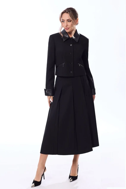 Жакет с центральной застежкой на петли и пуговицы, втачным воротником. По переду с рельефами, выходящими из проймы, на уровне линии талии расположены прорезные карманы в рамку с молниями. По спинке со средним швом и рельефами, выходящими из проймы. Рукав втачной, длинный, с отложной манжетой. Манжета закреплена к рукаву петлями и пуговицами. Юбка с отрезным поясом, односторонними складками по передней и задней половинке. На поясе- декоративная завязка, закрепленная полукольцами. На переднем полотнище- асимметричный разрез с застежкой на петли и пуговицы.