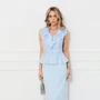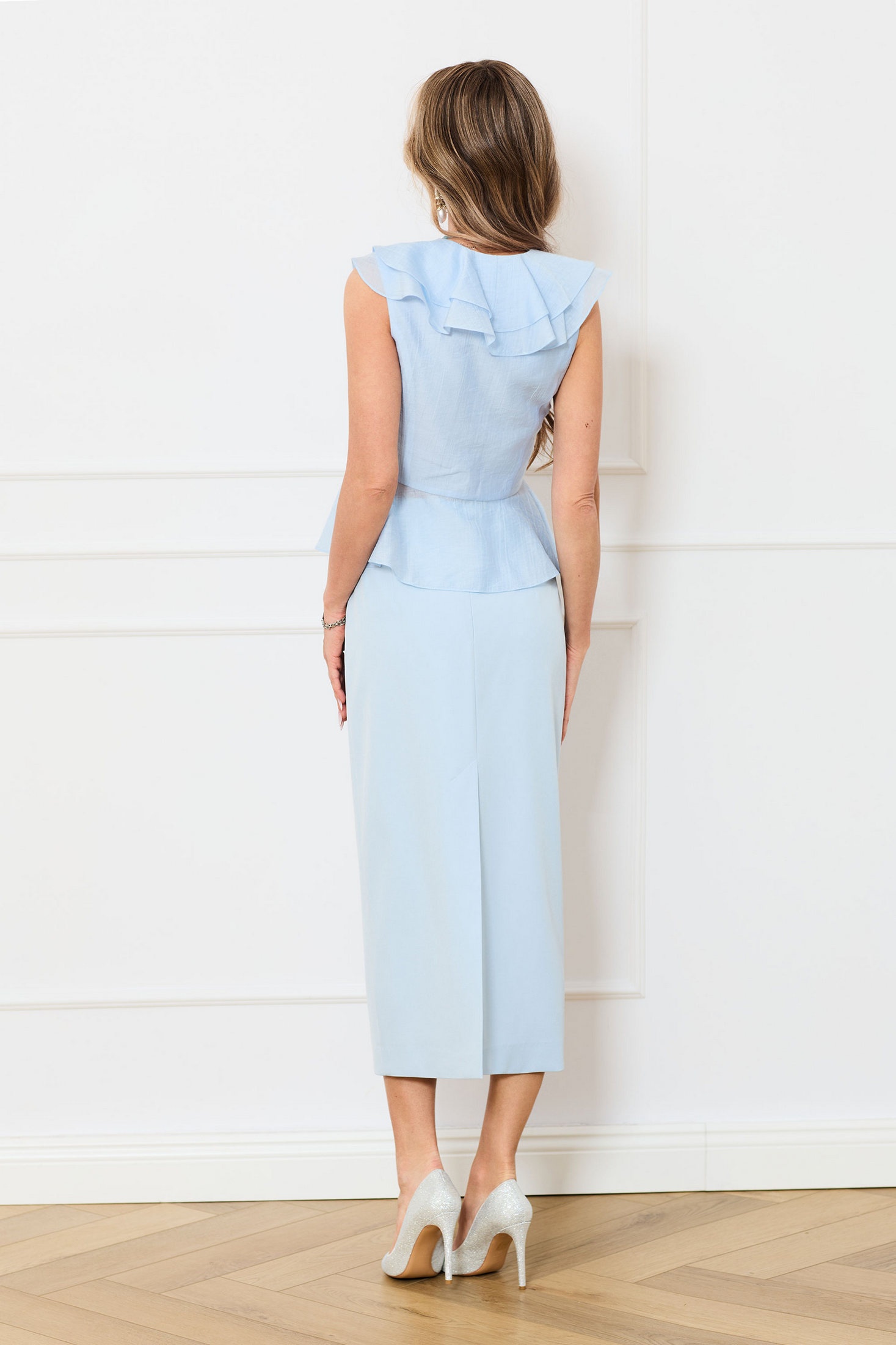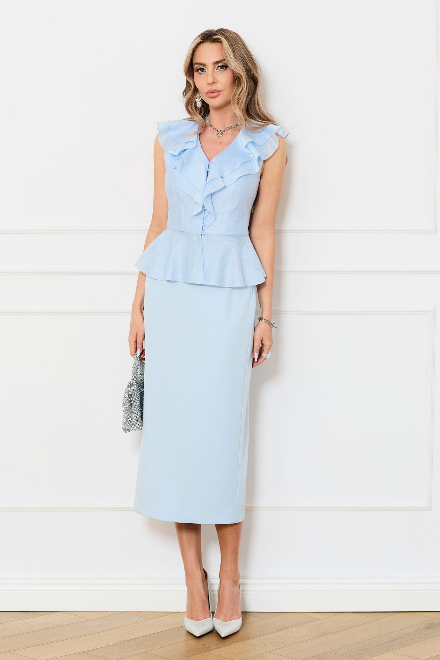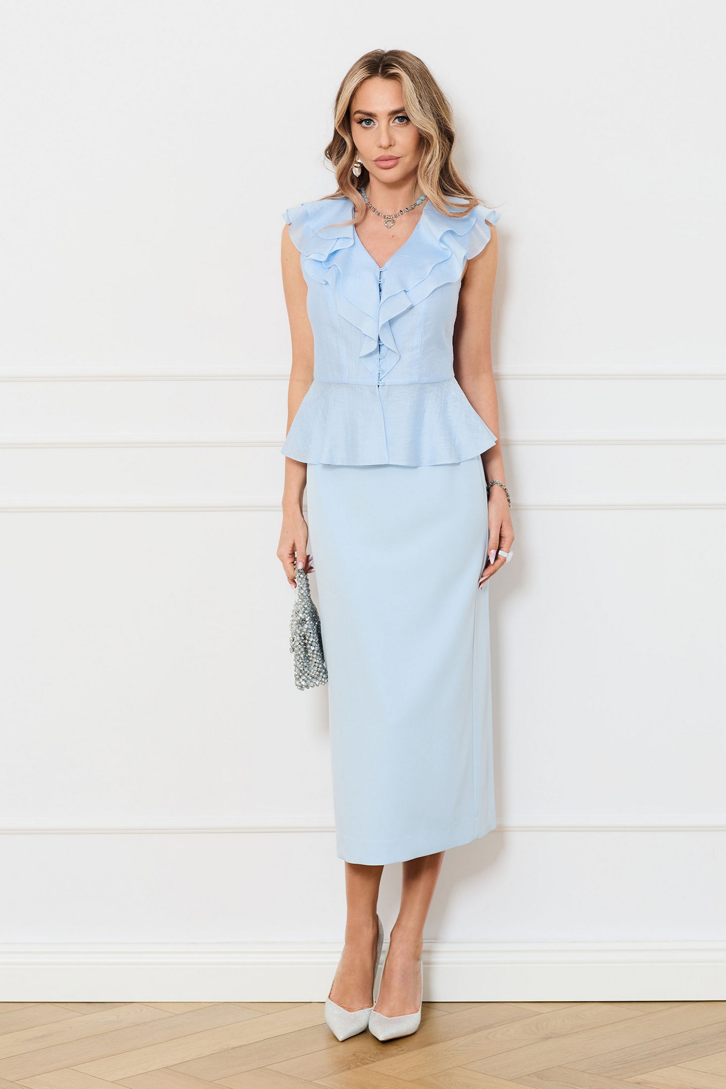 Костюм с юбкой 6742 голубой Golden Valley - воплощение современного стиля и комфорта. Коллекция бренда Golden Valley предлагает изысканный комплект, состоящий из блузки и юбки. Блузка без воротника с V-образным вырезом и рельефными линиями по переду и спинке задает лёгкость образу. Двойные воланы на горловине и бортах, а также баска по низу, подчеркивают женственность. Юбка на подкладке с потайной молнией и шлицей обеспечивает удобство ношения. Полуприлегающий силуэт идеально подходит для офиса и повседневной носки. Изготовленные из вискозы и полиэстера, изделия гарантируют комфорт в зимний сезон. Нежно-голубой цвет подчеркивает утонченность и стильность комплекта.