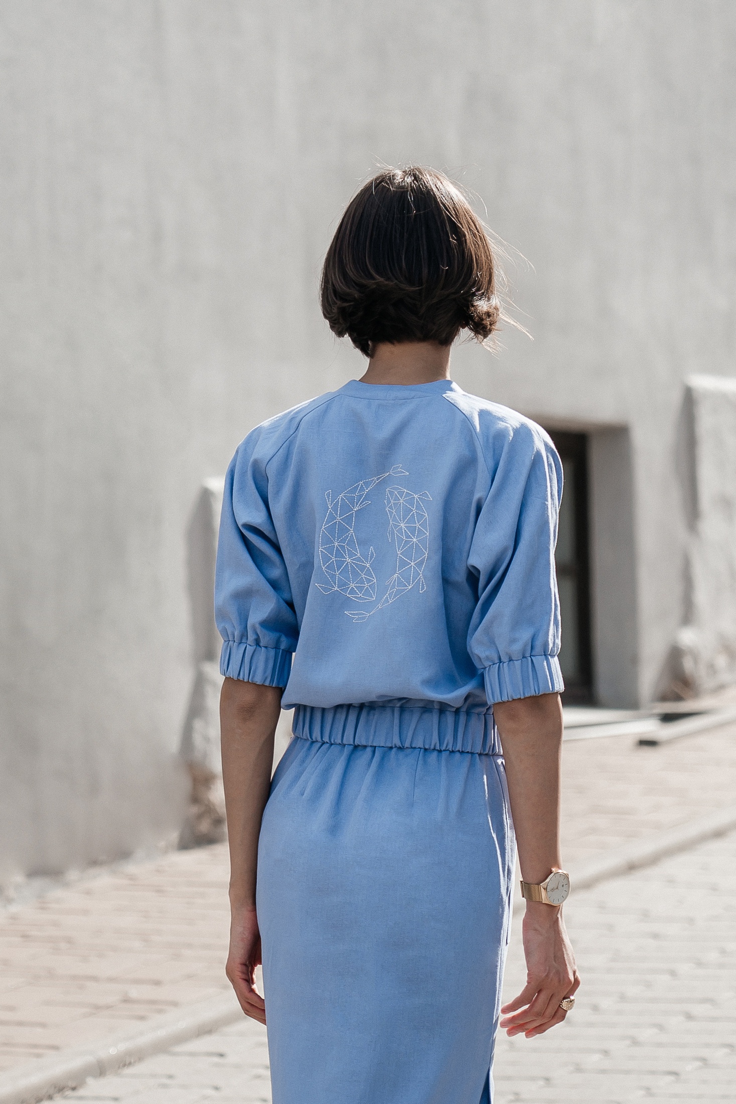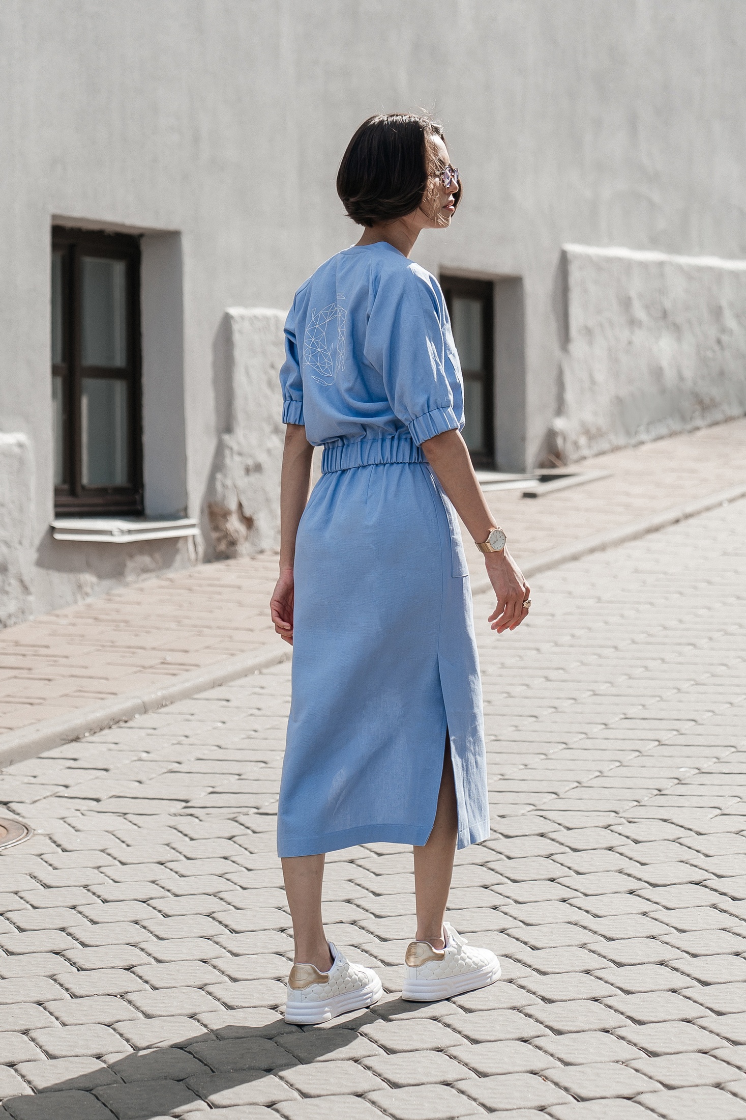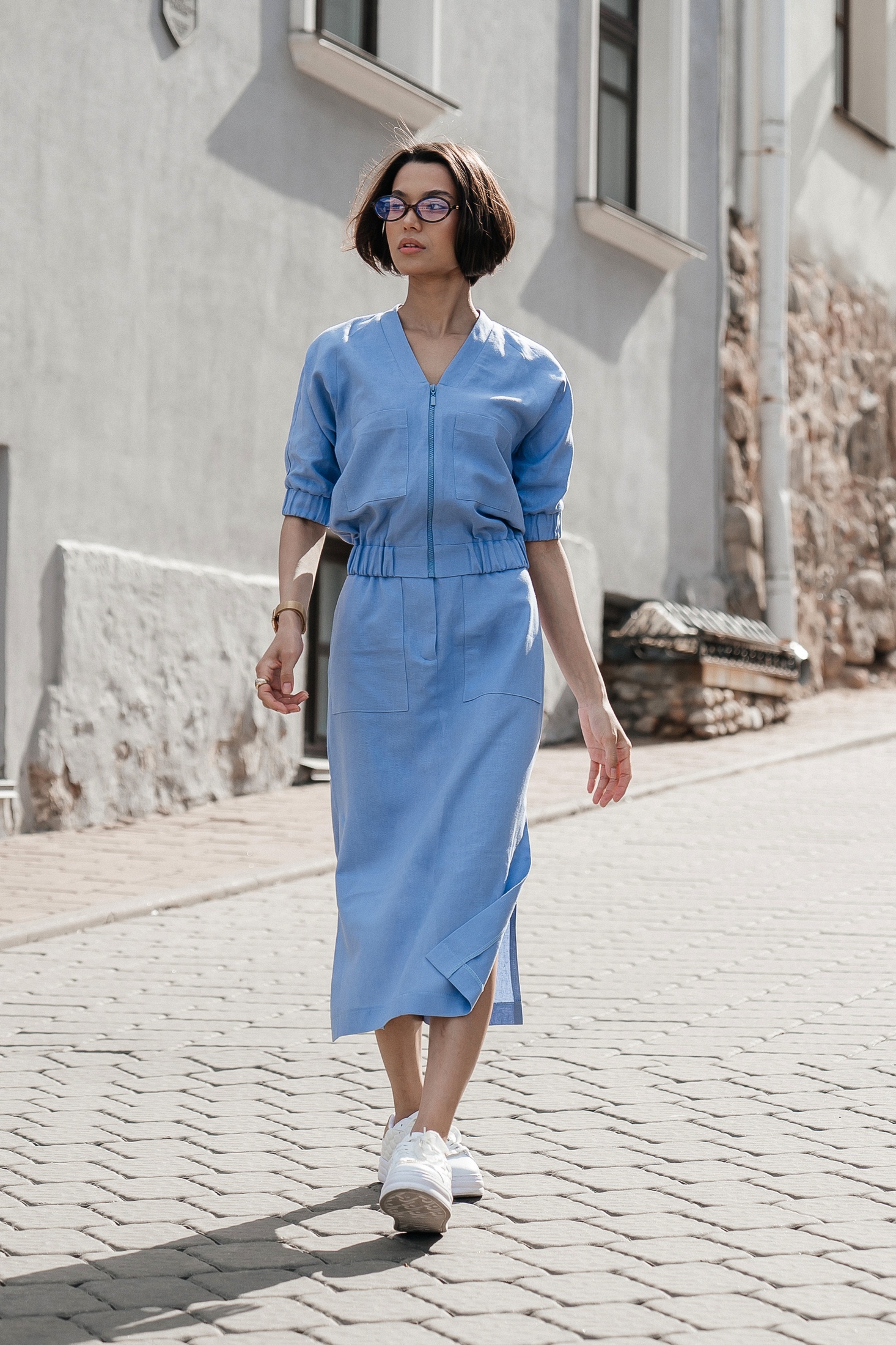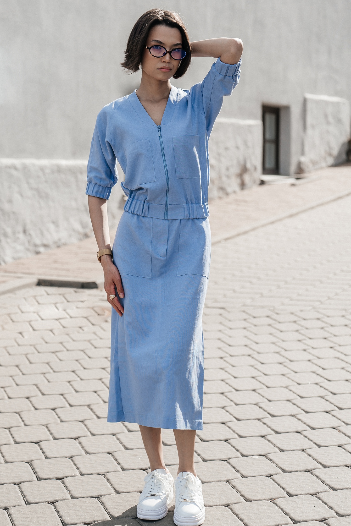 Костюм с юбкой 25ILor6 голубой ILOKA — это сочетание легкости и практичности для стильных образов от коллекции бренда ILOKA. Изготовлен из натурального голубого льна с добавлением вискозы, он обеспечивает привлекательный облик и удобство в повседневной и деловой жизни. Легкий бомбер на молнии с манжетами на резинке и стильными накладными карманами создает спортивный, но в то же время элегантный вид, идеально подходящий для теплого сезона. Юбка миди длиной 80 см с боковым разрезом и накладными карманами добавляет элемент женственности. Длина бомбера составляет 53 см, а длина рукава — 33 см, что позволяет обеспечить свободу движений и комфорт. Нежный голубой цвет костюма позволяет легко комбинировать его с различными аксессуарами для создания завершенного образа.