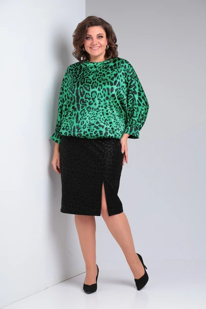 Нарядный и элегантный женский костюм, состоящий из двух элементов - блузы и юбки.Ткань изделия характеризуется низкой сминаемостью и высокой износостойкостью. Блуза - прямого силуэта с v-образным вырезом по горловине, линия плеча спущена, рукав свободный, длины 3/4 с продольным разрезом и приточной манжетой по низу. Спинка со средним швом. Юбка - классического прямого силуэта,длиной чуть ниже колена. Верхний срез юбки обработан приточным поясом на резинке.Перед юбки с разрезом.Рост модели 170 Длина блузы по спинке:69см.Длина рукава от горловины :59см.Ширина манжеты рукава :28см.Длина юбки с поясом:67см. Юбка 70% Вискоза 25% полиэстер 5% спандекс