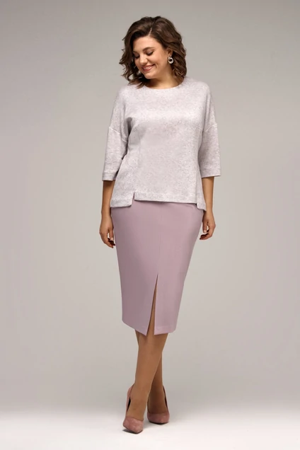 Костюм 2-х предметный трикотажный, состоящий из джемпера и юбки. Джемпер полуприлегающего силуэта со спущенными рукавами, с круглым вырезом горловины, по спинке декоративная молния. Трикотажная юбка на подкладке с разрезом по переду, застегивается на молнию и пуговицу сбоку. юбка: вискоза 70%, п/э 25%,спандекс 5%; подкладка: п/э 100%