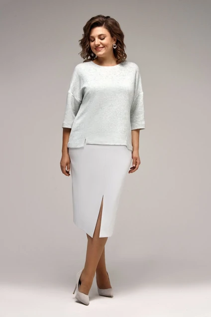Костюм 2-х предметный трикотажный, состоящий из джемпера и юбки. Джемпер полуприлегающего силуэта со спущенными рукавами, с круглым вырезом горловины, по спинке декоративная молния. Трикотажная юбка на подкладке с разрезом по переду, застегивается на молнию и пуговицу сбоку. юбка: вискоза 70%, п/э 25%,спандекс 5%; подкладка: п/э 100%