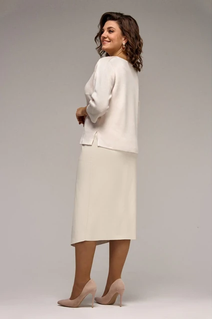 Костюм, состоящий из джемпера и юбки. Джемпер полуприлегающего силуэта из мягкого трикотажного полотна с добавлением ангоры, вырез горловины округлой формы, по боковым швам декоративные разрезы. Юбка выполнена из эко - кожи, на подкладке, по переду функциональные карманы, по низу юбки разрез, пояс притачной, в боковых швах вставлена эластичная тесьма для лучшего прилегания, застежка на молнию, петлю и пуговицу. Рекомендована бережная стирка при t 30; глажение при максимальной температуре прессующей поверхности утюга не более 110 С.