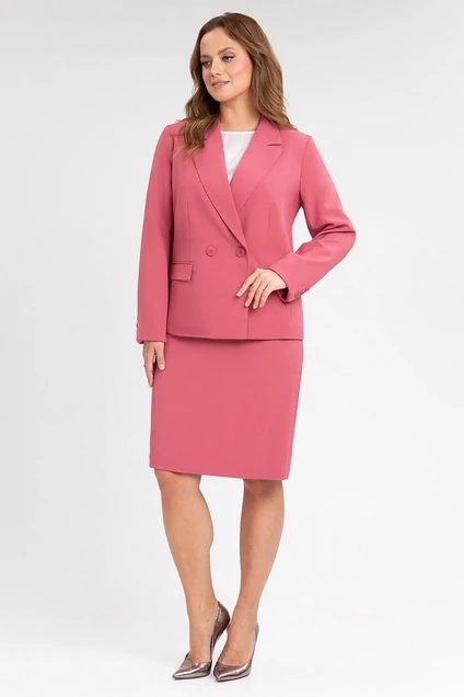 Классический костюм-двойка: жакет и юбка. Укороченный жакет полуприталенного силуэта, с двубортной застежкой на пуговицы. V-образный вырез горловины с воротником и лацканами. Спереди горизонтальные карманы с клапаном. Спинка со средним швом. Рукава заканчиваются имитацией шлицы с застежкой на пуговицы. Жакет на подкладке.