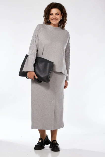 Костюм женский юбочный, изготовлен из трикотажного полотна.Джемпер свободного кроя. Горловина обработана воротником — стойка. Рукав — реглан с вышивкой шнуром. Низ фигурный. Юбка прямого силуэта, пояс на резинке, цельнокроеный. По переду обработан шов со шлицей внизу.