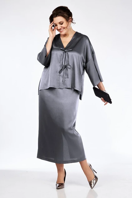 Костюм женский, юбочный изготовлен из костюмно — плательной ткани. Блуза свободного кроя, горловина V-образной формы. По краю борта притачные планки, застежка на завязках. Рукава спущенные, длинной 3/4 . Юбка прямая, верх на обтачке, застежка потайная молния в заднем шве, разрез внизу. Юбка на подкладке.