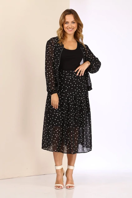 Комплект женский , состоящий из бомбера топа и юбки. Бомбер из шифона без подкладки с центральной бортовой затежкой на молнию. Рукав втачной собранный по низу на декоративную манжету. Юбка на трикотажной подкладке длины миди на кокетке со складками . Топ из вискозы без рукавов с округлым вырезом горловины. Длина юбки 83 см , длина бомбера 58 см , длина рукава 58 см