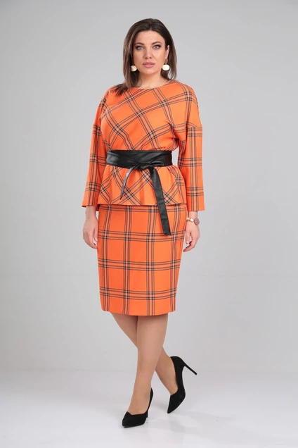 Комплект женский , состоящий из топа и юбки , топ без подкладки полуприлегающего силуэта с округлым вырезом горловины и спущенной линией плеча. Рукав 3/4. Юбка прямая , зауженная к низу на притачном поясе с застежкой на молнию. Пояс из эко кожи в комплекте. Длина топ 59 см , длина рукава 33 см , длина юбки 63 см