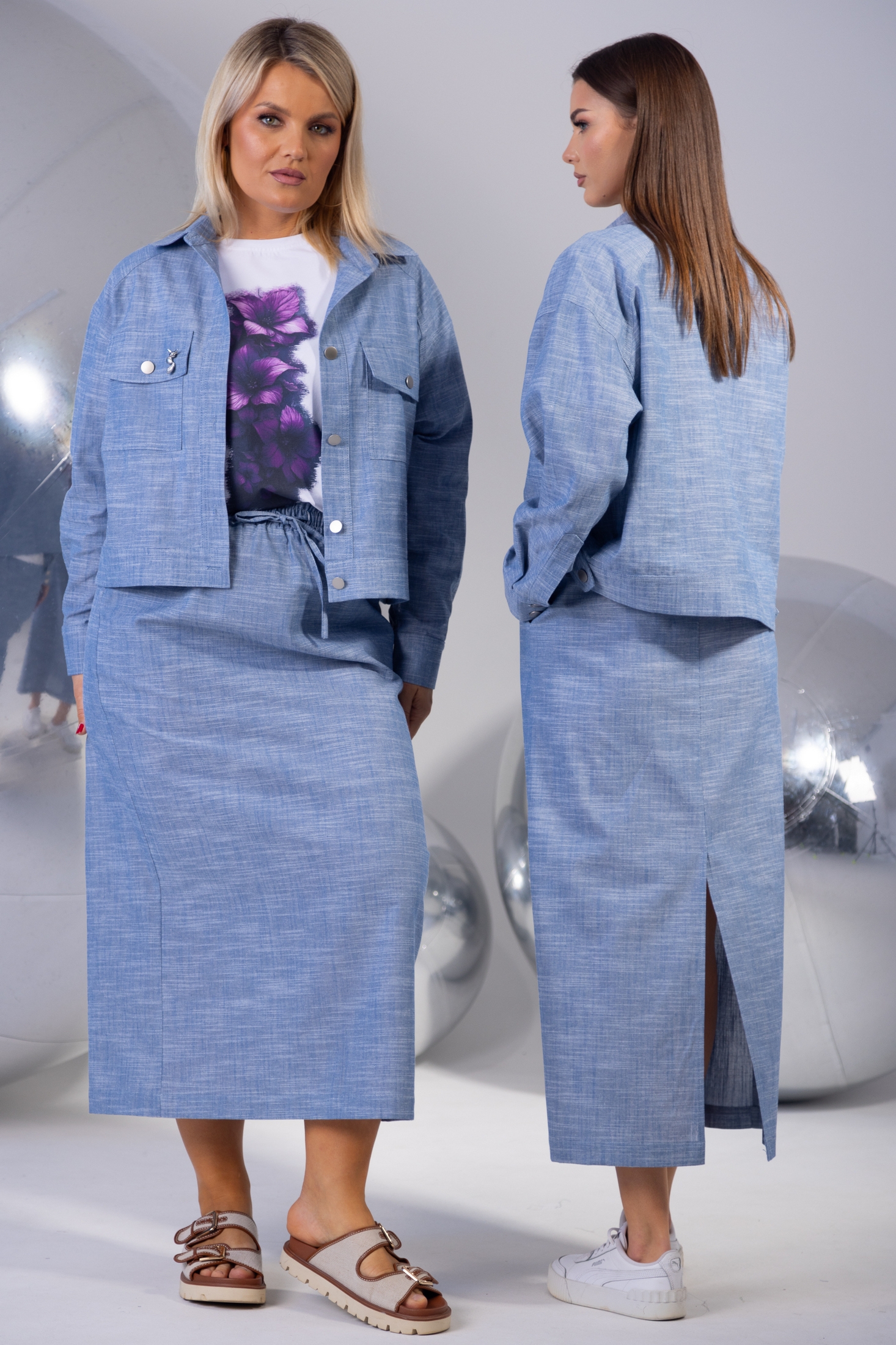 Представляем стильный льняной костюм, который станет жемчужиной вашего летнего гардероба! Этот гармоничный комплект сочетает модный укороченный жакет и длинную юбку с разрезом, создавая идеальный баланс между утончённостью и практичностью.