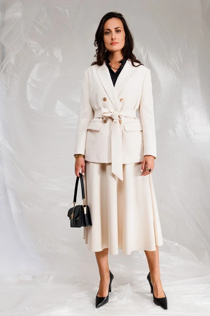 Комплект состоит из базового жакета с поясом и юбки солнце. Базовый двубортный жакет прямого силуэта. Жакет выполнен из плотной полувискозной ткани. Жакет свободного кроя на подкладке, с подплечиками. Застежка смещенная. По переду расположены карманы с клапанами. Рукав одношовный спущенный.