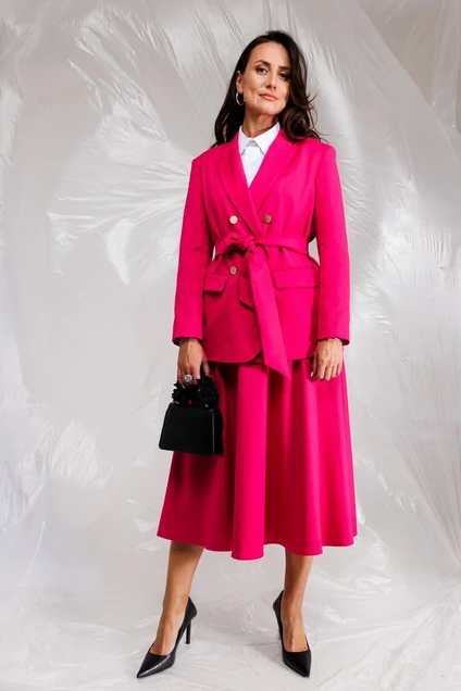 Комплект состоит из базового жакета с поясом и юбки солнце. Базовый двубортный жакет прямого силуэта. Жакет выполнен из плотной полувискозной ткани. Жакет свободного кроя на подкладке, с подплечиками. Застежка смещенная. По переду расположены карманы с клапанами. Рукав одношовный спущенный.