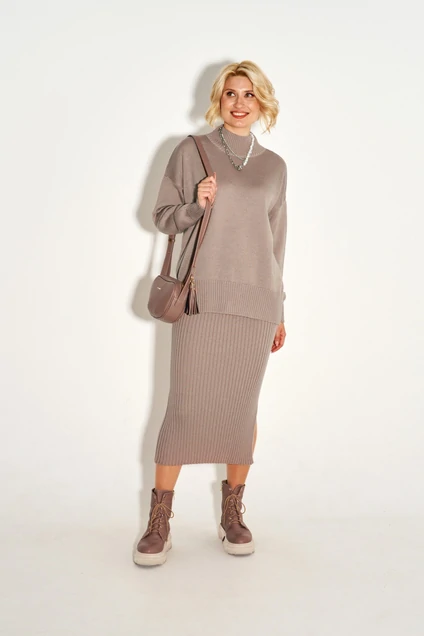 Комплект состоит из юбки и джемпера. Юбка в обтяжку, длиной миди.