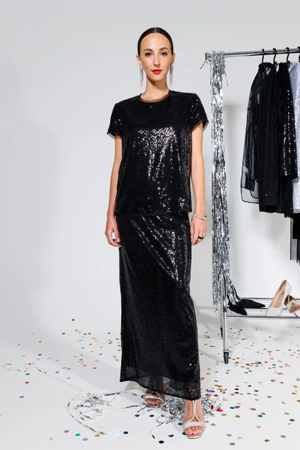 Сияющий комплект из мерцающих пайеток. Комплект состоит из блузки прямого силуэта и юбки на резинке. Блузка с застежкой по спинке на пуговицу. Юбка с разрезом сзади внизу. Если вы хотите стать самой яркой и привлекательной девушкой вечера - этот комплект именно для вас. Блузку и юбку можно носить отдельно, блузка прекрасно сочетается с брюками или джинсами высокой посадки. Юбку можно сочетать с базовой футболкой или рубашкой.