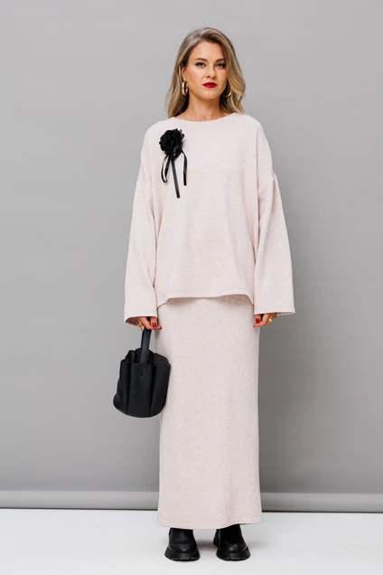 Трикотажный комплект состоящий из юбки в пол и джемпера свободного силуэта. Джемпер оверсайз, длина 70 см. По переду брошь. Юбка пояс на резинке+декоративный шнурок. Сзади расположен высокий разрез. Длина юбки - 95 см