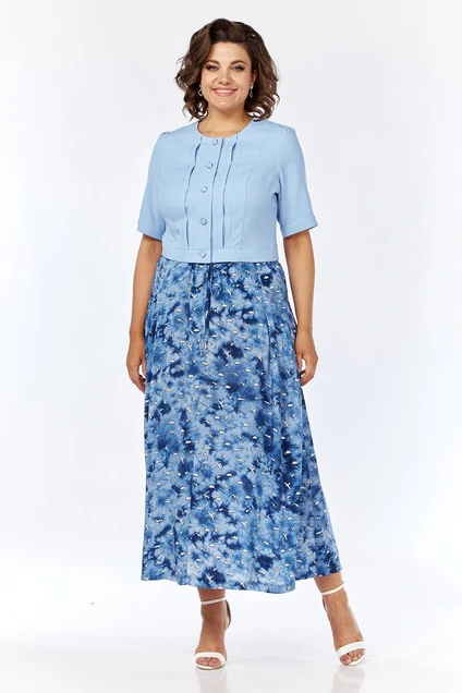 Костюм 2-ух предметный. Состоит из жакета и юбки. Жакет полуприлегающего силуэта, укороченный, с круглым вырезом горловины. Перед с центральной бортовой застежкой на петли-пуговицы и рельефами от плечевых швов до низа. От горловины до низа вдоль борта втачная деталь с заложенными встречными складками, фиксирующимися закрепками. Спинка со средним швом и рельефами от плечевых швов до низа. Рукав 2-х шовный, втачной, с притачной манжетой, по низу. На манжете застежка на петлю-пуговица и разрез. Юбка зауженная к низу, длиной закрывающей колено. Верх юбки на притачном поясе с эластичной тесьмой по боковым швам. Заднее и переднее полотнище юбки с талиевыми вытачками. В среднем шве заднего полотнища застежка на тесьму-"молния" и шлица. На поясе застежка на петлю-пуговица. Размеры 48-52: длина жакета - 42 см, длина рукава изделия - 44 см, длина юбки -72 см. Юбка: вискоза 100%.