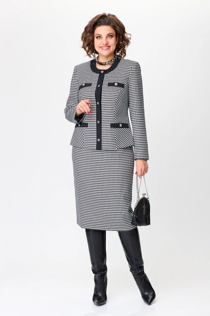 Элегантный стильный и одновременно очень универсальный и комфортный юбочный костюм в стиле CHANEL, который несомненно будет приковывать взгляды окружающих к Вашему образу. Костюм женский полуприлегающего силуэта, жакет на подкладке с округлым вырезом горловины и с притачной планкой из контрастной ткани по полочкам и горловине, с застежкой на петли-пуговицы. На полочках жакета имеются рельефы и декоративные листачки с пуговицами. На спине обработаныф талиевые вытачки. Рукав длинный, втачной, двухшовный. Юбка на подкладке, с притачным поясом, с застежкой на потайную тесьму-молнию и пуговицу, с разрезом в среднем шве заднего полотнища. В поясе юбки по бокам вставлена резинка для регулировки обьема талии. Длина жакета-58см. Длина рукава-62см. Длина юбки-67см.