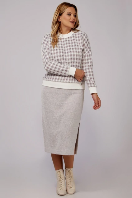 Костюм женский (джемпер и юбка). Джемпер женский, прямого силуэта, длиной до линии бедер, со спущенной проймой, с втачными рукавами, с втачной бейкой по горловине, с втачной планкой по низу. Рукава втачные одношовные, с притачными манжетами. Вырез горловины округлой формы. Юбка женская из трикотажного полотна, длиной ниже коленей, с цельнокроеным поясом, в который вставлена эластичная тесьма, в левом боковом шве обработан разрез. Переднее полотнище юбки с 2-мя вытачками. Джемпер: длина спинки – 57,5см. Юбка: длина середины спинки – 76см. Джемпер: длина рукава - 43см, ширина низа рукава – 40см.