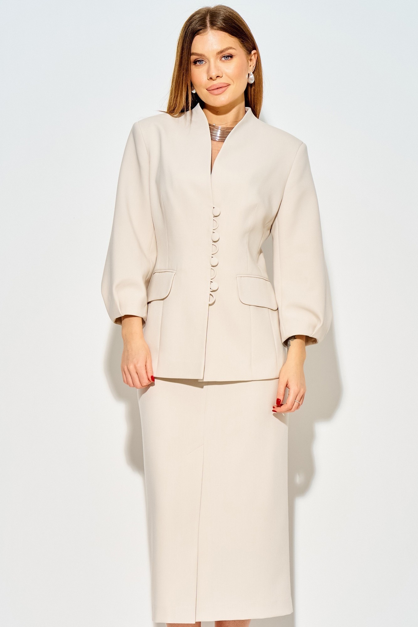 Костюм с юбкой 124 бежевый LAIKONY сочетает в себе утонченность и функциональность. Коллекция бренда LAIKONY предлагает офисный костюм, выполненный из костюмной ткани с добавлением полиэстера, вискозы и спандекса, обеспечивающий комфорт и легкость в носке. Жакет прилегающего силуэта с длиной по спинке 69 см и рукавами 3/4 подчеркивает женственность и элегантность. Удобные элементы включают центральную застежку на пуговицы и практичные карманы с клапанами. Юбка с длиной 80 см предлагает свободу движения благодаря шлице, а притачной пояс и потайная молния обеспечивают идеальную посадку. Бежевый цвет и классический стиль делают этот костюм универсальным выбором как для офиса, так и для вечерних встреч.