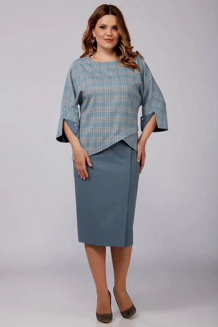 Юбка на бедрах, прямого силуэта, длиной ниже коленей, на подкладке, с притачным поясом, с застежкой на потайную тесьму-молнию в левом боковом шве и 1 петлю и пуговицу на поясе. Переднее полотнище юбки с одной вытачкой и рельефным швом, который заканчивается шлицей. На деталях заднего полотнища обработаны 2 вытачки. Длина изделия Жакет: длина спинки – 56,5см. Юбка: длина середины спинки – 65см.