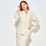 Костюм женский (жакет и юбка). Жакет женский, полуприлегающего силуэта, длиной до линии бедер, с цельнокроеными рукавами, со съемным поясом. Деталь спинки жакета со средним швом, вверху шва обработана застежка на 1 петлю и 1пуговицу. Рукава цельнокроеные, длиной ¾, понизу обработаны разрезы, на передней части разреза застежка на 1 петлю и пуговицу. Вырез горловины округлой формы, обработан обтачкой. Низ жакета асимметричной формы.