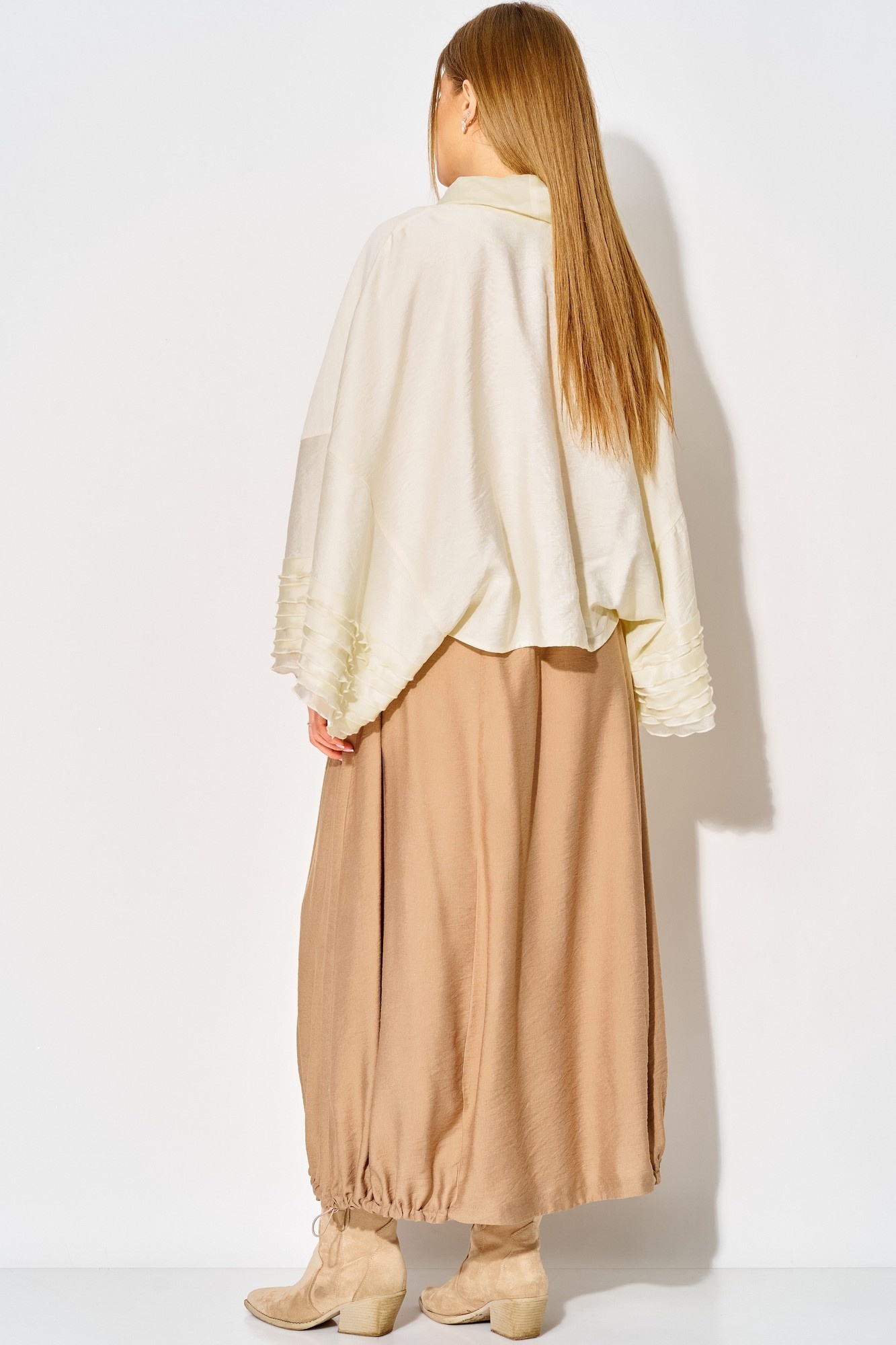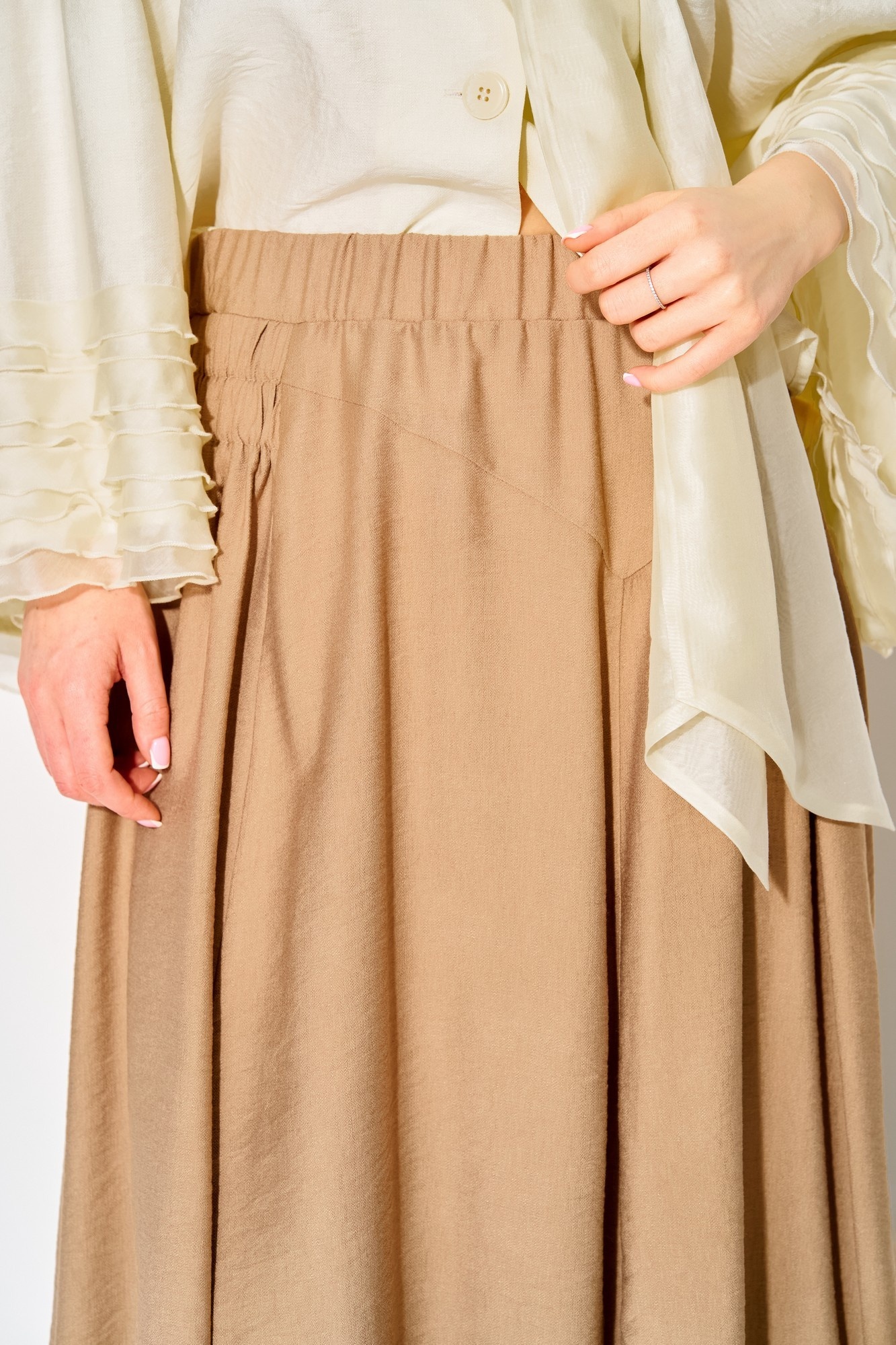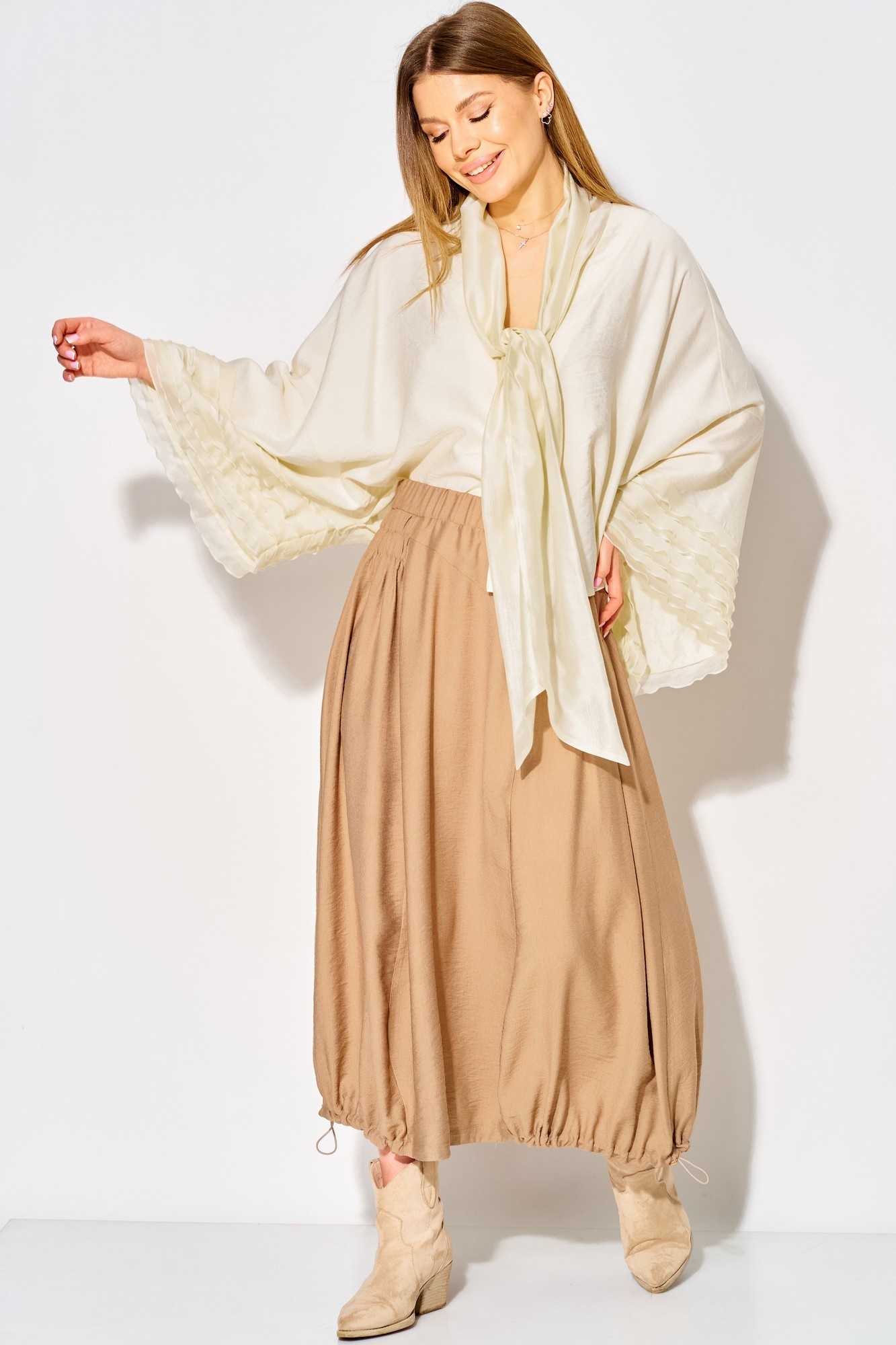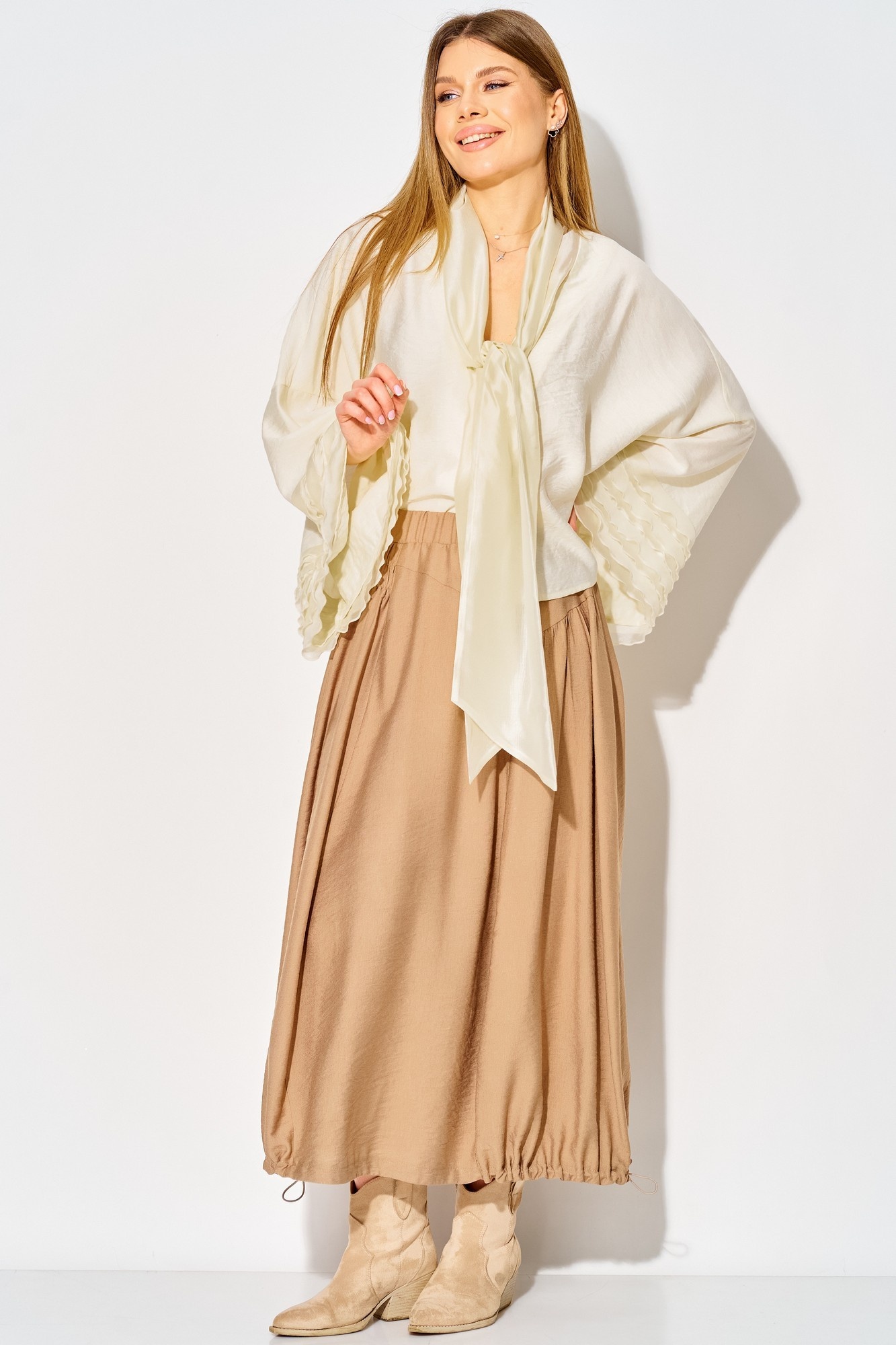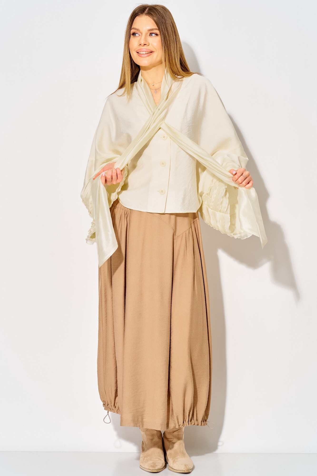 Костюм с юбкой 934 жемчужный + миндаль LAIKONY – это впечатляющее сочетание стиля и комфорта. Коллекция бренда LAIKONY представляет собой блузу и юбку, выполненные из вискозы с крэш-эффектом. Блуза свободного силуэта с длиной по спинке 54 см имеет спущенную линию плеча, V-образный вырез и шалевый воротник. Изящные воланы на рукавах длиной 65 см добавляют легкости. Юбка длиной 80 см с притачным поясом и эластичной тесьмой обеспечивает комфортную посадку и отличается рельефными швами. Эта модель идеально подходит для осенне-весеннего сезона, а жемчужный и миндальный цвета придают образу свежесть и универсальность.