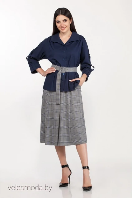 Пышная юбка-миди оформлена по талии притачным поясом (по бокам резиночки), апереди - 4 клина ,по центру - глубокая шлица - это модная деталь нынешнего сезона, на боковых деталях у пояса - внутренние карманы. Заднее полотнище из 4 клиньев, сверху застежка молния и пуговица. Блузк асредней длины, свободного силуэта, с отложным воротником (сзади на стойке), линия плеча приспущена, впереди застежка на пуговицы, у плечевого шва по 2 складочки. По спинке центральный шов. По боковым швам - разрезы. Рукав 3/4 притачная манжета с отворотом, фиксируется патой с пуговицами по всей длине рукава. Комплект дополнен двумя сьемными поясами, подчеркивающими блузку в области талии. Меняя пояса по выбору создаются определенные образы от спортивного до романтического.Комплект отлично смотрится и под кроссовки, и под туфли.
