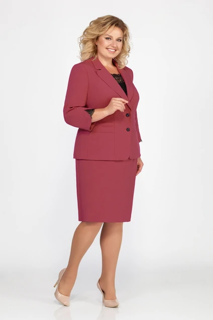 Костюм трехпредметный: жакет, юбка, топ. Костюм выполнен из костюмной ткани со стрейчем, вставки на рукавах и сзади жакета снизу выполнены из высококачественного кружева, которое придает шарм и роскошь этому комплекту. Топ выполнен из вискозы со вставками из этого же кружева. Состав топа: 95% вискоза, 5 % спандекс. Длина жакета сзади по спинке 61 см , длина рукава 48 см. Длина юбки 59 см.