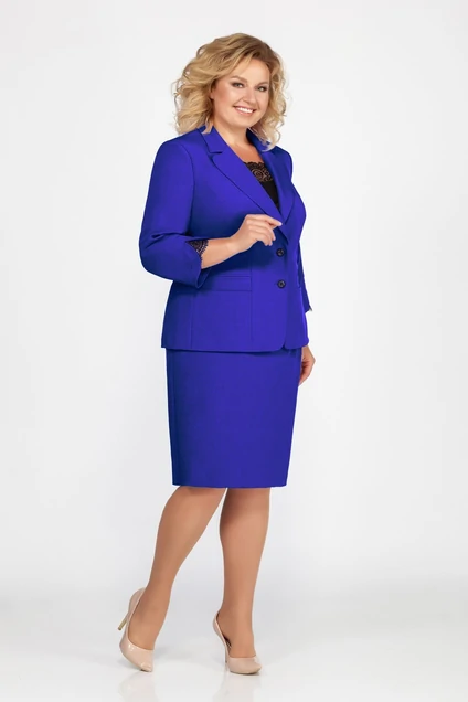 Костюм выполнен из костюмной ткани со стрейчем, вставки на рукавах и сзади жакета снизу выполнены из высококачественного кружева, которое придает шарм и роскошь этому комплекту.