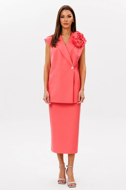 Стильный эффектный комплект, состоящий из двубортного жилета в стиле oversize, удлиненной юбки и съемного текстильного украшения в виде цветка ручной работы.