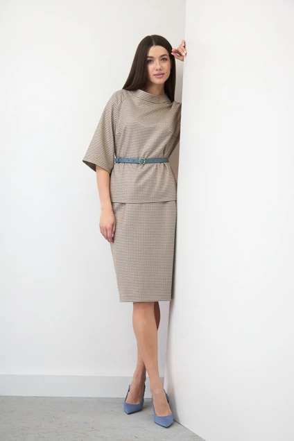 Стильный комплект, состоящий из блузона и юбки, из костюмной ткани. Блузон прилегающего силуэта, слегка расклешён к низу. Спинка со средним швом. В среднем шве спинки – потайная застёжка-молния. Длина по спинке – 56,5 см. Горловина обработана стойкой – воронкой, высотой- 3,5 см. Рукав – реглан, слегка расклешён к низу. Длина рукава – 41,5 см. Юбка прилегающего силуэта, зауженная к низу, по среднему шву – потайная застёжка на тесьму – молнию, в низу – разрез. Верхний край обработан обтачкой. Длина юбки по боковому шву – 64 см. Юбка на подкладке. Декор – ремень, может отличаться от заявленного на фото.