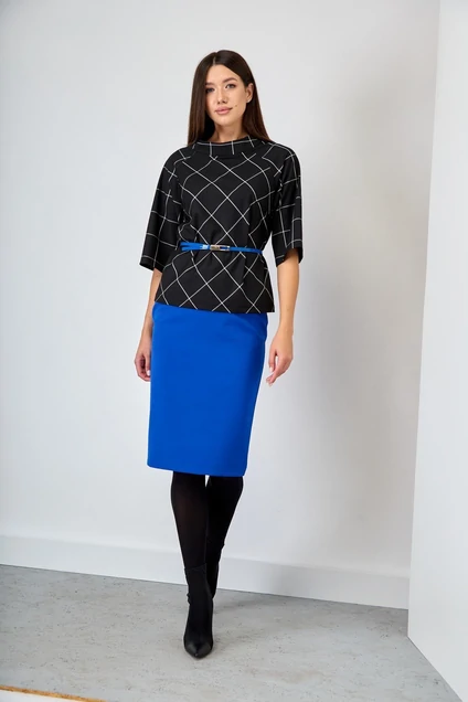 Красивый и удобный комплект, состоящий из блузона и юбки. Блузон прилегающего силуэта слегка расклешён к низу. По полочке: нагрудная вытачка. В среднем шве спинки потайная застёжка-молния. Горловина обработана стойкой-воронкой высотой 4,5см. Длина блузона по спинке от стойки – 54 см. Рукав – реглан, слегка расклешён к низу, длиной – 42,5 см. Юбка на подкладке, зауженная к низу, по среднему шву – потайная застёжка на тесьму-молнию, внизу разрез. Верхний край обработан обтачкой. Длина юбки по боковому шву 64 см. Цвет комплекта может отличаться на полутон от заявленного на фото. Декор: съёмный пояс, может отличаться от заявленного на фото.