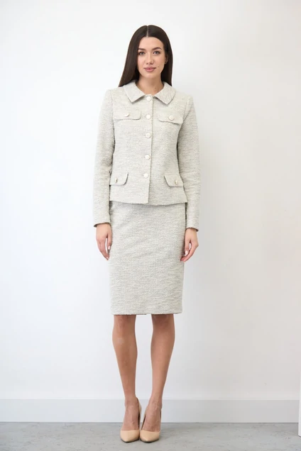 Костюм состоит из прилегающего однотонного жакета и юбки на подкладе.
