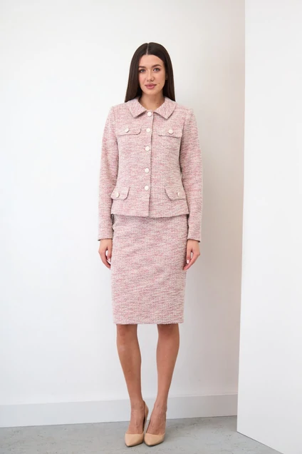 Костюм состоит из прилегающего однотонного жакета и юбки на подкладе.