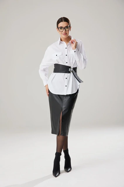 Стильный комплект, состоящий из рубашки оверсайз со съемным кожаным поясом и обегающей кожаной юбки-миди с разрезом спереди. Рубашка оверсайз прямого силуэта с рубашечным воротником на стойке и зауженным рукавом на манжете, со спущенной линией плеча. Спереди на функциональной планке петли-пуговицы. На линии груди расположены два кармана с клапаном на пуговице. Спинка изделия имеет горизонтальную плечевую кокетку и встречную складку для свободы облегания. По плечевому шву заложена складка. Низ блузона слегка фигурный: спинка и полочка чуть длиннее бокового шва. Длина изделия блузона по спинке-72 см в размерах 44-48, в р.50-52-длина изделия на 3 см больше. Длина спущенного плечевого шва-32 см. Длина рукава с манжетой-40 см. Юбка-миди облегающего силуэта на подкладке и поясе обтачке. Спереди в вертикальном шве расположен разрез, высотой 33 см. Сзади, в среднем шве расположена застежка-молния. По линии талии переднего и заднего полотнища юбки расположены вытачки. Длина юбки-73 см. Комплект дополнен съемным текстильным кожаным поясом-корсетом, с застежкой на пряжке из полуколец. На затягивающем хлястике пояса расположена декоративная контрастная тесьма. Высота пояса 11 см.