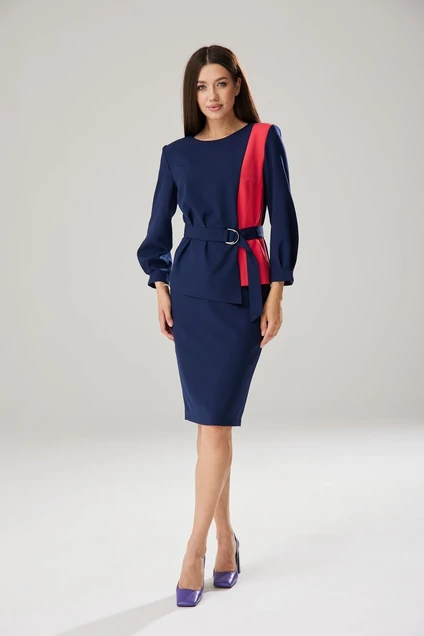 Элегантный комплект, состоящий из блузона с ассиметричной вставкой из контрастного тона в блузоне и облегающей юбки на подкладке. входы Блузон полуоблегающего силуэта, спереди расположены горизонтальные вытачки. Передняя часть состоит из двух деталей: контрасного бочка меньшей ширины и большей центральной части. Центральная часть по низу изделия ниже основной длины на 6 см. По спинке расположен средний шов, в котором находится застежка-молния. Длина по среднему шву спинки 57 см. Горловина округлой формы. Рукав втачной, обьемный у запястья, длиной 53 см. По низу рукава расположены отстроченные встречные складки, высотой 4 см, имитирующие манжет. Юбка комплекта облегающего силуэта, на подкладке, зауженная к низу. По талии расположены талиевые вытачки, верхний край юбки обработан обтачным поясом. В среднем шве расположена застежка-молния и открытый разрез, высотой 20 см. Длина изделия по боковому шву 64,5 см. Комплект дополнен текстильным сьемным поясом с пряжкой из полуколец. Длина пояса 103 см, ширина 4 см