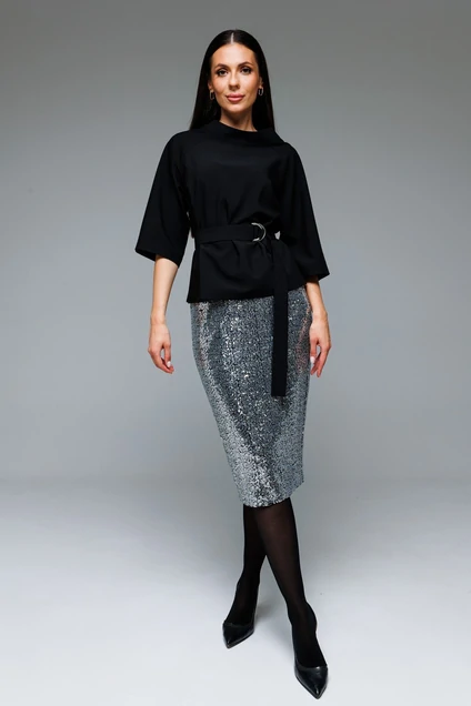 Юбка на подкладке прямого силуэта, чуть зауженная к низу. В среднем шве размещена потайная молния и открытый разрез. На линии талии размещены классические вытачки. Пояс внутренний, обтачной. Длина юбки по боковому шву-70 см. Высота разреза-21 см.