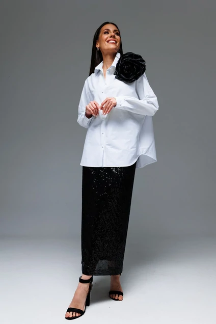 Стильный комплект, состоящий из рубашки, гламурной длинной юбки из пайеток и брошь-декора.