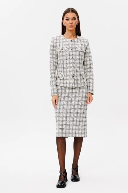 Классический комплект из молочно-черного принта клетки, состоящий из жакета и юбки прилегающего силуэта на подкладке.