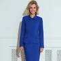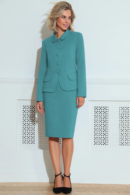Комплект, состоящий из жакета и юбки. Жакет полуприлегающего силуэта на подкладке с рельефами по переду и спинке, с отрезным поясом по талии и накладными карманами с клапаном. Рукав втачной двухшовный длинный, воротник стояче-отложной. Застежка центральная бортовая на обтяжные пуговицы. Юбка на подкладке, зауженная к низу с притачным поясом и на резинке в размерах 50-54. Застежка в юбке на потайную тесьму-молнию в среднем шве заднего полотнища и шлицей.