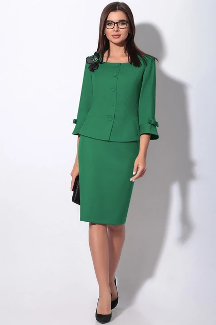 Комплект женский состоящий из жакета и юбки. Жакет на подкладке прилегающего силуэта с центрально-бортовой застежкой на 5 обтянутых в ткань жакета пуговиц, вырез горловины фигурный. По переду и спинке отрезная часть- баска, декоративные рельефы. По баске переда расположены декоративные элементы - имитация карманов в рамку. Рукав двухшовный с притачным воланом. Юбка на поясе с резинкой по бокам в рр.50-54, заужена к низу, переднее полотнище с двумя декоративными рельефами. Заднее - со шлицей и с застежкой на потайную тесьму-молнию. Костюм украшает съемная брошь ручной работы и декоративные бантики на рукавах.