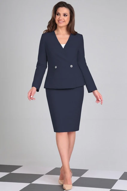 Комплект женский состоящий из жакета, юбки и топа. Жакет на подкладке, приталенного силуэта, втачного покроя, отрезной по линии талии, нижняя часть жакета выполнена в виде баски состоящей из двух частей. По переду и спинке рельефы из проймы. спинка со средним швом. Вырез горловины V-образный. Застежка смещенная. двухбортная на 2 декоративные пуговицы и петли. Рукав двухшовный, длинный.