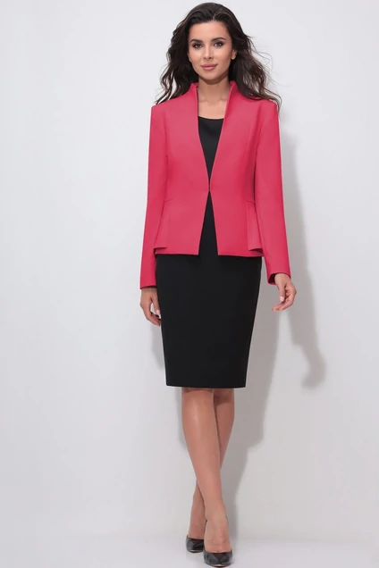 Комплект женский состоящий из жакета, юбки и топа. Жакет на подкладке, приталенного силуэта, втачного покроя, отрезной по линии талии, нижняя часть жакета выполнена в виде баски состоящей из двух частей. По переду и спинке рельефы из проймы. спинка со средним швом. Вырез горловины V-образный. Застежка смещенная. двухбортная на 2 декоративные пуговицы и петли. Рукав двухшовный, длинный.