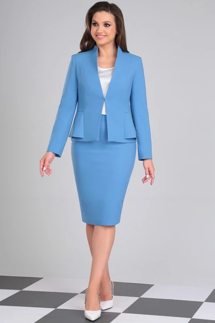 Костюм женский 3-х предметный, состоящий из блузы, жакета и юбки. Жакет полуприлегающего силуэта на подкладке. По переду и спинке рельефы, карманы отсутствуют, застежка на потайной крючок. Воротник - фигурная цельнокроенная стойка. По талии есть баска, переходящая на спинку. Рукав втачной, двухшовный, длинный. Блуза женская полуприлегающего силуэта с круглым вырезом, с коротким рукавом. Юбка на подкладке зауженная к низу со шлицей. В р44-48 без пояса,в р 50-54 юбка на притачном поясе с резинкой. В среднем шве заднего полотнища застежка на потайную тесьму-молнию.