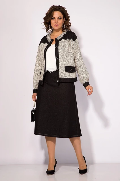 Эффектный юбочный костюм, в стиле CHANEL, выполнен из сочетания хлопкового Джинса и рогожки! Модель состоит из стильного жакета, свободного силуэта. Жакет на подкладке, с округлым вырезом горловины. Застежка центральная, на притачной планке из отделочной ткани на петли и пуговицы. Рукав вточной, длинный, на спущенном плечевом поясе. Низ рукава оформлен притачным манжетам с застёжкой на пуговицу. Полочка и спинке с кокеткой, отсроченной 2-ой строчкой. Также на полочке расположены декоративные клапаны с имитацией карманов. Юбка в комплекте трапециевидного силуэта, с боковыми рабочими карманами. Юбка на притачном поясе, в боковых участках вставлена резинка для более комфортного прилегания. Юбка с застежкой на тесьму-молнию и средним швом по спинке.