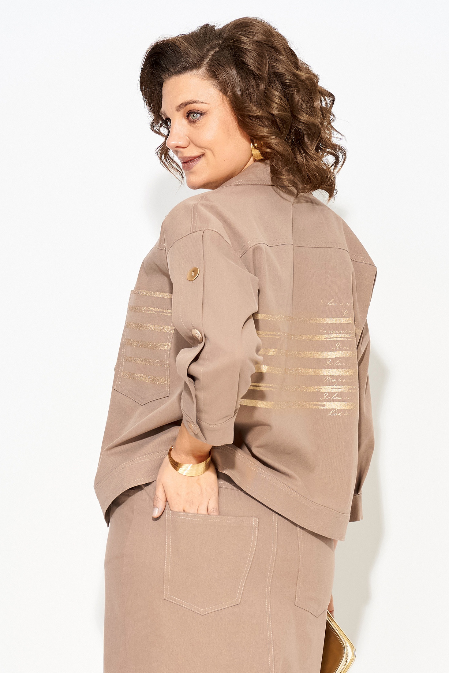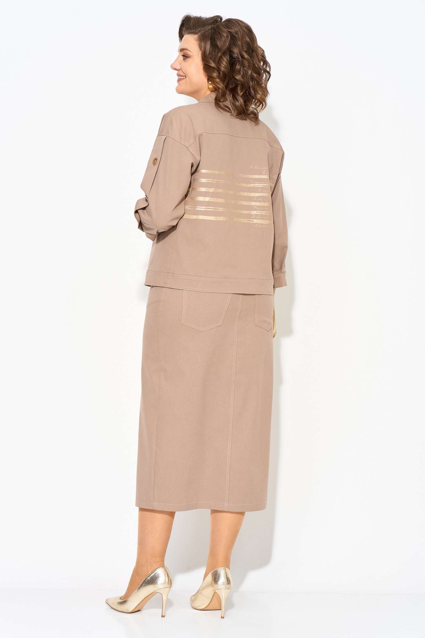 Костюм с юбкой 1405Н мокко Liliana-style сочетает в себе стиль и комфорт. Коллекция бренда Liliana-style предлагает костюм из хлопкового денима, состоящий из зауженной юбки-карандаш и свободного жакета. Жакет имеет отложной воротник и центральную застежку на пуговицы, украшен асимметричной печатью на спинке. Рукав 3/4 с декоративными пуговицами добавляет модели повседневного стиля. Юбка длиной 80 см, с пикантным разрезом и металлической молнией, дополняется притачным поясом с резинкой. Цвет мокко подчеркивает универсальный характер костюма, который подойдет для офиса или прогулки в теплое время года. Длина жакета составляет 60 см, а рукав — 50 см.