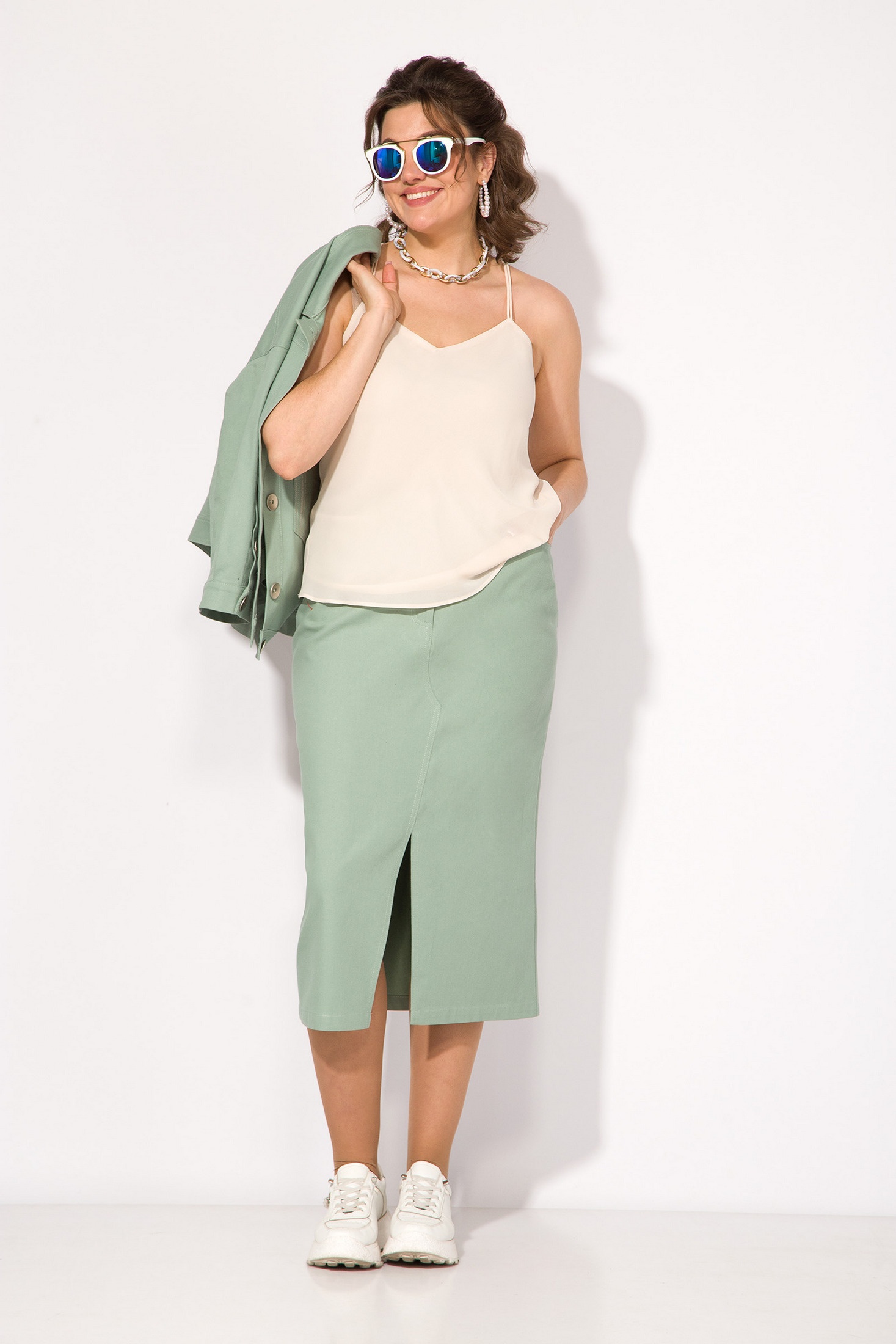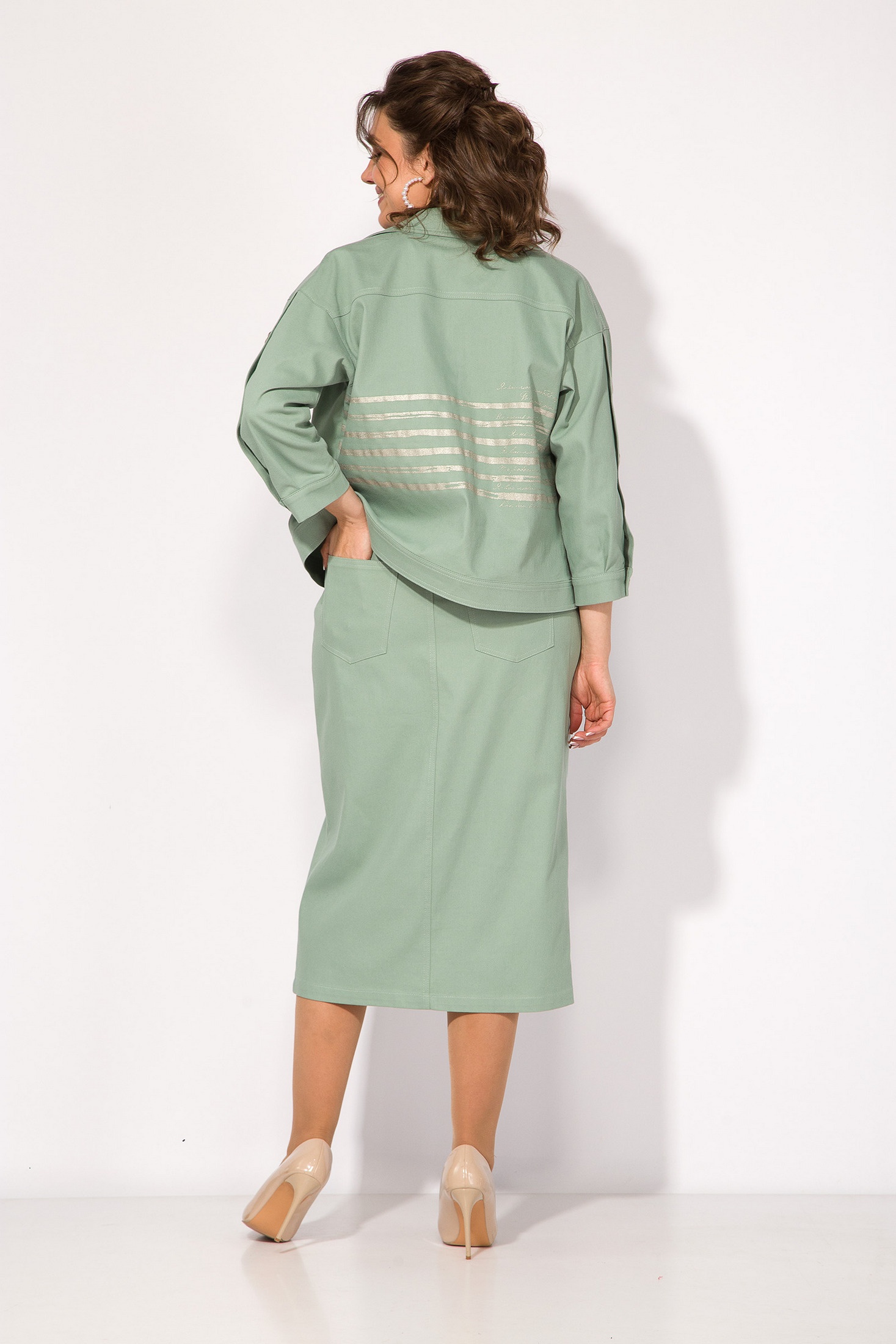 Костюм с юбкой 1405Н олива Liliana-style очаровывает своим оригинальным дизайном. Коллекция бренда Liliana-style предлагает стильный комплект из хлопкового денима. Жакет свободного силуэта с отложным воротником и застежкой на пуговицы, дополнен рулоном со спущенным плечевым поясом и длиной 3/4 на притачной манжете. Ассиметричный накладной карман и декоративная застежка придают уникальность модели. Юбка-карандаш зауженная к низу, длиной 80 см, имеет пикантный разрез и застежку на металлическую молнию. Накладные карманы на спинке и резинка на поясе обеспечивают комфорт. Оливковый цвет и неподвластный времени фасон делают этот костюм идеальным выбором для весеннего и осеннего гардероба. Длина жакета – 60 см, рукав – 50 см. Длина юбки – 80 см.