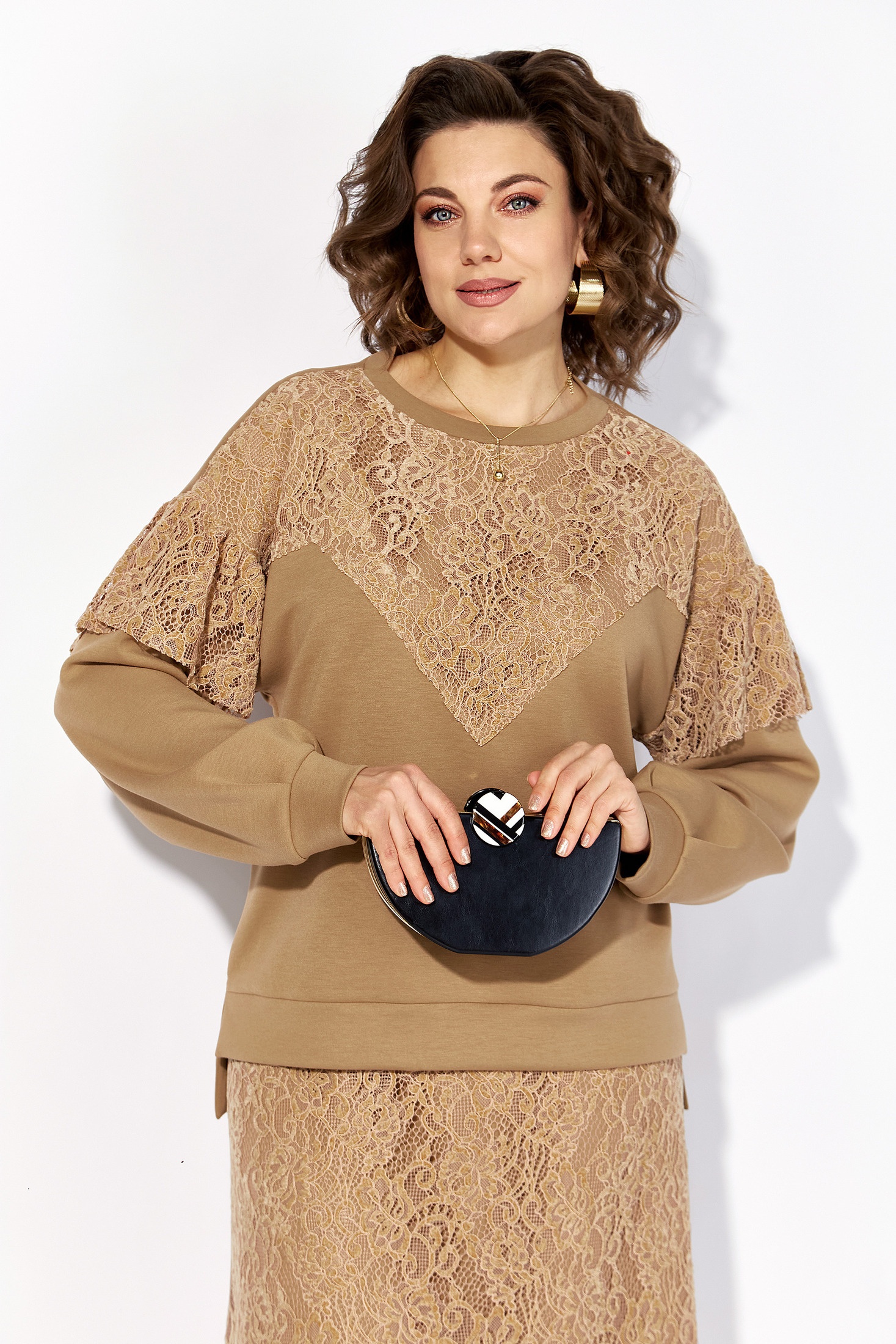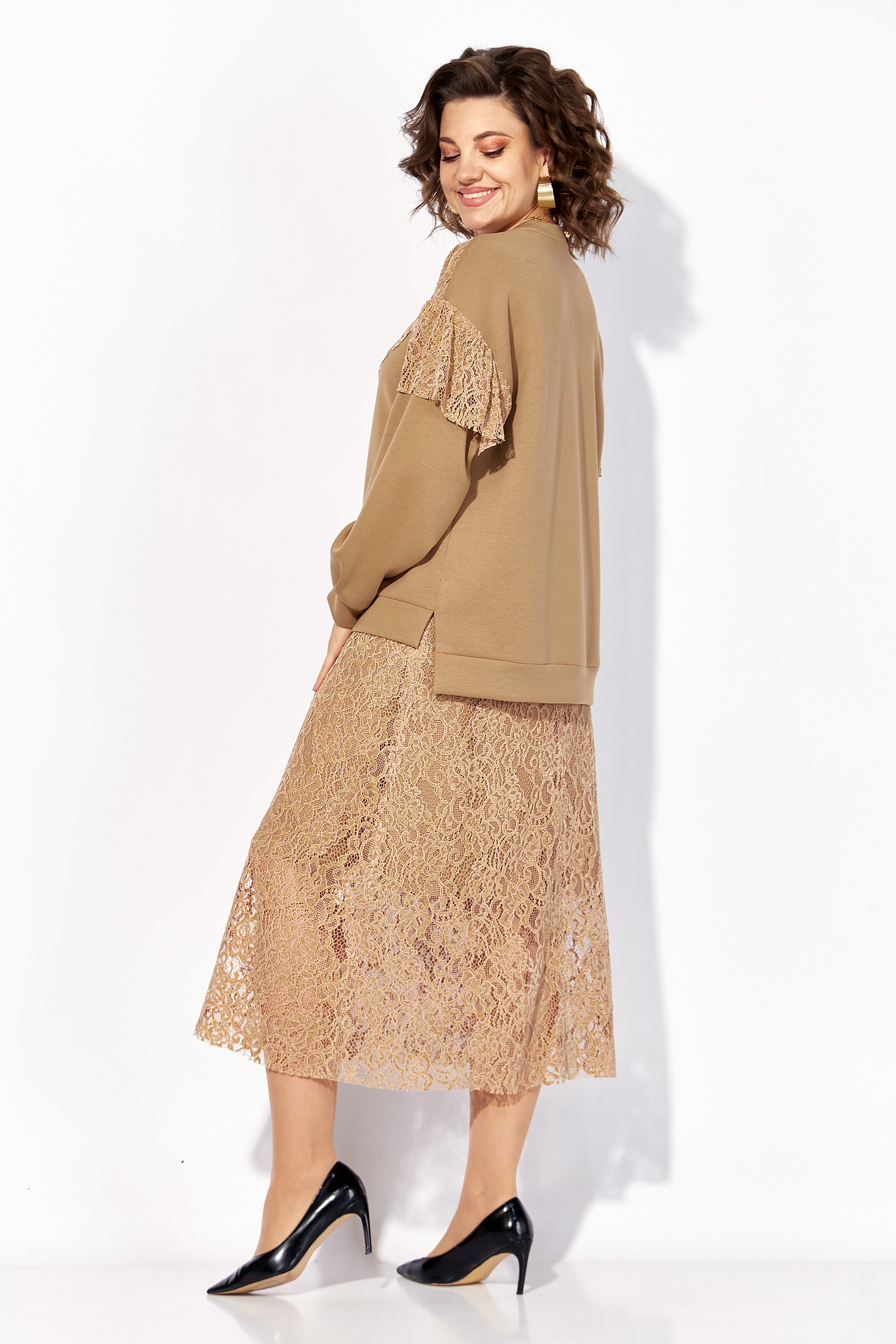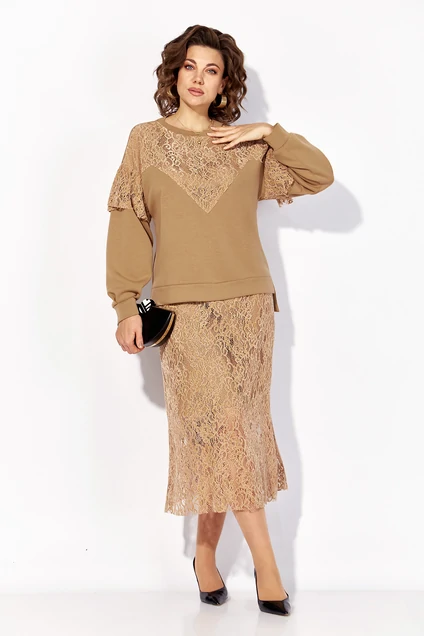 Представляем вашему вниманию уютный теплый женский костюм от бренда «Лилиана»! Он состоит из стильного джемпера и клешеной юбки миди– идеальный выбор для современных женщин, стремящихся совмещать комфорт и элегантность в повседневной жизни. Джемпер с округлым вырезом горловины, на мягкой планке свободного силуэта, со спущенной линией плеча. Рукав длинный, на притачной манжете с заложенными мягкими складками. Линия декольте украшена кокеткой из кружева. По плечу идет мягкий кружевной волан на сборку, что придает романтичность образу. Юбка выполнена из трикотажного кружева, на подкладке. Пояс круговая резинка.