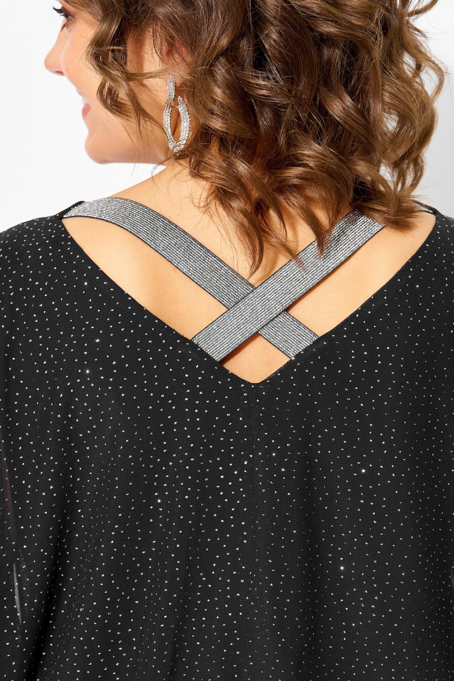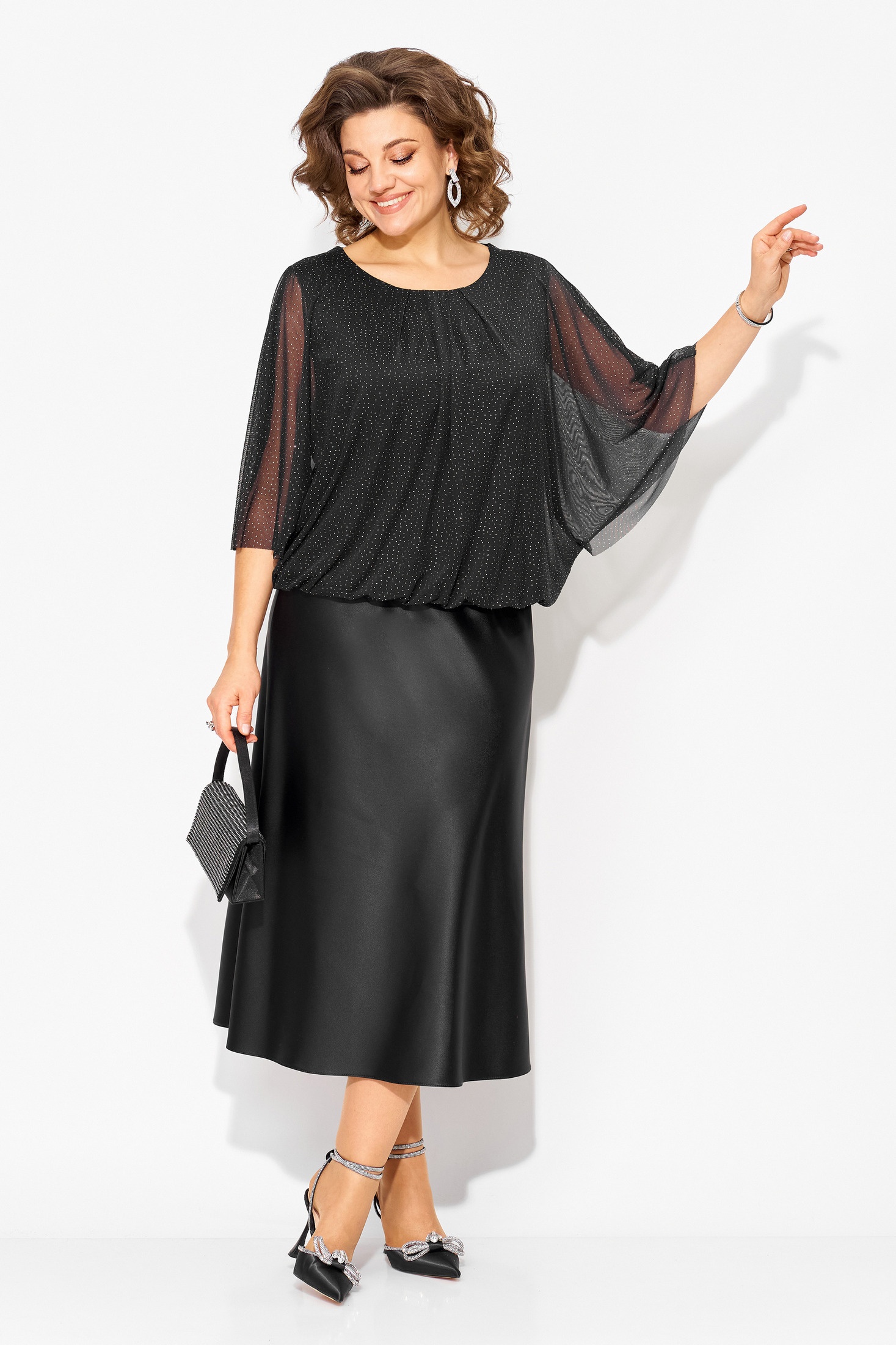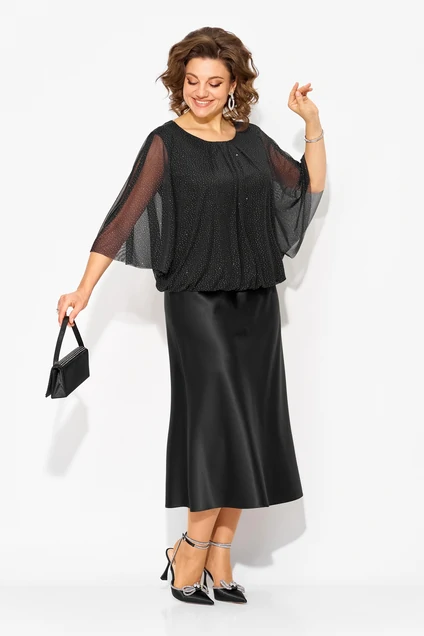 Костюм с юбкой 1502К Liliana-style привлекает внимание своим уникальным стилем бохо и нарядными нотками. Коллекция бренда Liliana-style отличается выразительным дизайном и качественными материалами. Блузка из вискозы и полиэстера с добавлением спандекса обладает мягкостью, комфортом и легким мерцанием благодаря прозрачным рукавам. Эффектный вырез на спине и декоративная резинка придают изделию особый шарм. Юбка миди из атласного сатина с трикотажной подкладкой садится идеально благодаря поясу на круговой резинке. Фасон блузки и юбки позволяет использовать костюм в качестве вечернего или праздничного наряда. Черный цвет делает ансамбль универсальным для любого события. Длина по спинке составляет 62 см, юбка – 88 см.