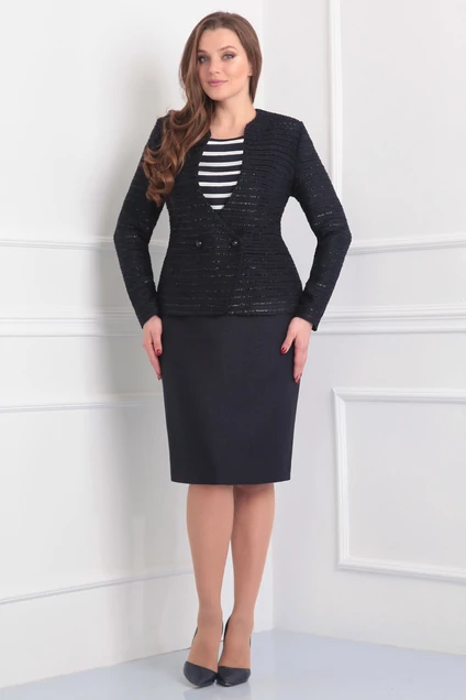 ЖАКЕТ: Длина-59см, ПОГ:54р-57,5см, 56р-59,5см, 58р-61,5см. ПОБ:54р-61см, 56р-63см, 58р-65см. Длина рукава - 60,5см. ЮБКА: Длина-61,5см. ПОТ:54р-47см, 56р-49см, 58р-51см. ПОБ:54р-60см, 56р-62см, 58р-64см. БЛУЗКА: Длина-56,5см. Ткань текстильная (юбка) -- 75% полиэстер, 20% вискоза, 5% спандекс
