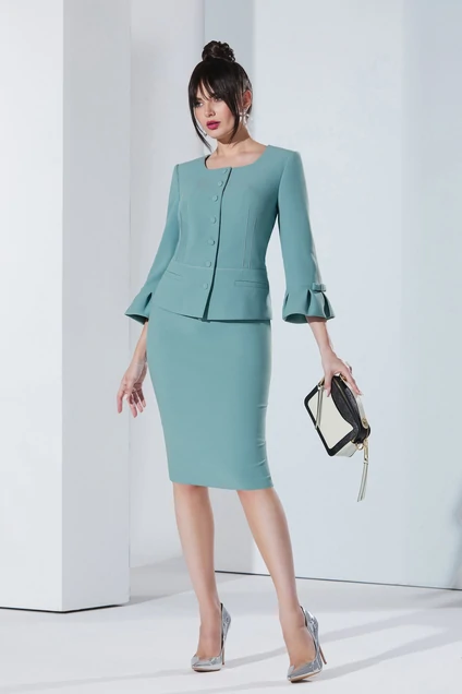 Элегантный костюм в духе современной парижской классики и раннего «Christian Dior» поможет сохранить женственность в условиях офисного дресс-кода. Приталенный жакет прилегающего силуэта отрезной по линии талии с квадратным вырезом со скругленными углами, слегка расширен по бокам (мягкое полукарэ). Перед с двумя вертикальными вытачками от подреза и центральной застежкой на петли и пуговицы , на отрезной детали выполнены прорезные листочки (имитация карманов). Маленький дизайнерский штрих декоративная отстрочка и пуговицы обтянутые тканью. Спинка со средним швом и талиевыми и 4-мя вертикальными вытачками от подреза. Рукав втачной , двухшовный с притачным воланом, заложенным мягкими складками. По низу рукава пришиты декоративные бантики, средний шов с декоративной отстрочкой. Юбка карандаш с отрезным поясом , застежка на потайную молнию в боковом шве, по низу юбки разрез. Нижний шов пояса и средний шов по спинке с декоративной отстрочкой как на рукаве.